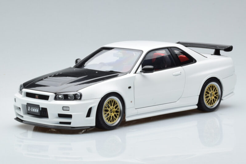 The Nissan Skyline GT-R R34 Nismo Z-Tune Fehér MotorHelix 1:18 is crafted from Fém. Die-cast zinc alloy body with detailed plastic parts, rubber tires, and high-quality paint finish. Die-cast models are known for their weight, durability, and realistic feel.