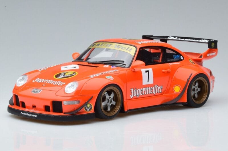 The Porsche 911 993 RWB Jagermeister Asia Edition GT Spirit 1:18 is crafted from Gyanta. High-quality resin with hand-painted details and limited production runs. Resin models offer exceptional detail and are prized by serious collectors for their craftsmanship.