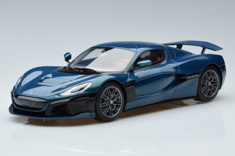 A 1:18 scale model measures approximately 25-28 cm (approximately 10-11 inches). The Rimac Nevera Kék GT Spirit 1:18 is perfect for display in a glass cabinet or on a shelf.
