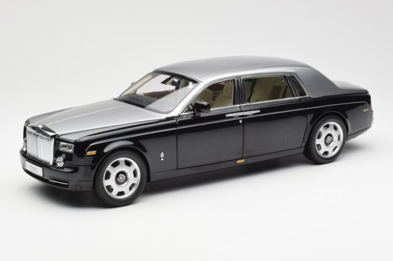 The Rolls-Royce Phantom VII EWB Fekete és Ezüst Kyosho 1:18 is crafted from Fém. Die-cast zinc alloy body with detailed plastic parts, rubber tires, and high-quality paint finish. Die-cast models are known for their weight, durability, and realistic feel.